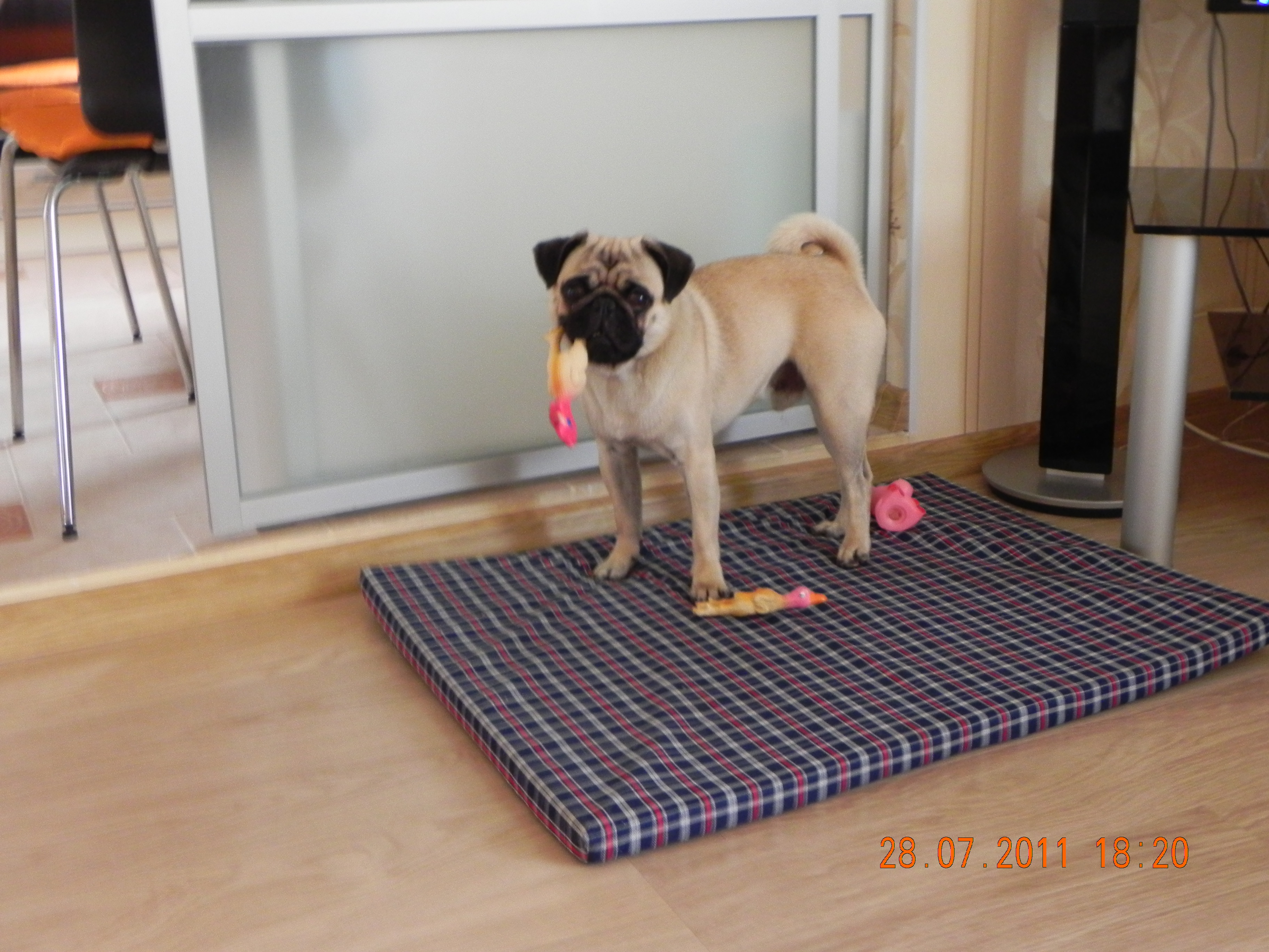 Давно посещаю ваш форум и много полезного нашла, вот решилась зарегистрироваться и уже общаться на полных правах. В жизни не хотела заводить собаку дома, пока у соседей не увидели мопсика – ну разве можно не влюбиться в такое чудо природы??? И вот в новой квартире с только что сделанным ремонтом у нас появилось очаровательное и милое существо, которое мы назвали по домашнему Моня (по родословной Риччи) . Папа у него Клопсики Мопсики Красавец Кэдмон Крис – это я уже потом обратила внимание, когда книгу Захаровой почитала, стало интересно кто у него папа (IMG:style_emoticons/default/smile.gif) ), мама Анфиса из Вологды. |
