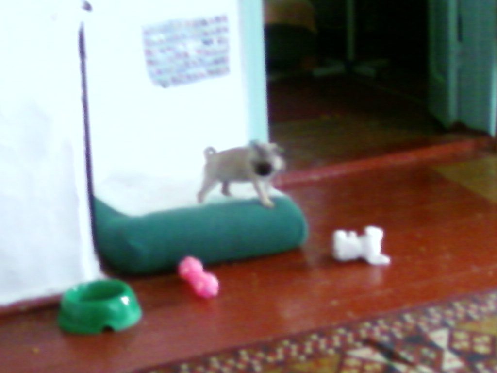 Чудо-собака с половины четвертого не дает спать. Проснулся оттого, что кто-то возле кровати вошкается. Включил светильник в изголовье - и увидел раскосую мордашку. Ксюха встала на задние лапки и ну сопеть и пыхеть, чтобы я ее взял на кровать. И началось. гонки по кровати, кусание руки, поцелуйчики в лицо. Потом раскопки подушки, с надеждой что-нибудь внутри. Потом кушать захотели, потом какать. Потом опять скачки, закапывание глазок. Потом срыгнула чуть-чуть. Видно немножко перекормил. Потом полчаса сна и новые развлечения. Попытка разобратся с проводом удлиннителя под напряжением. Получила выговор строгим голосом и сразу обиделась, надулась и сидя под стулом дулась три минуты. Стало весело жить, хоть какое-то развлечение. При попытке сфотографировать на мобильник в фас, в кадре остается только задница с хвостиком. Успевает крутнуться и убежать.