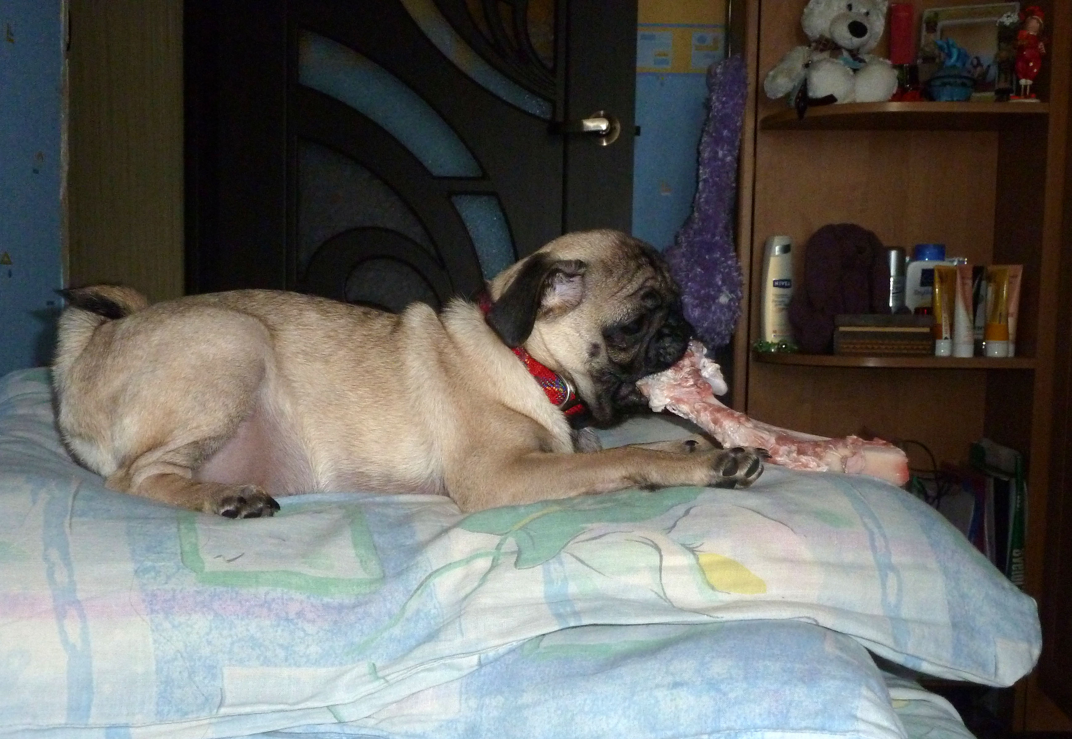 Вчера рассказывала мужу про Лушу и ее большую кость (на фото). Сказала, что я бы такую тоже не отдала. (IMG:style_emoticons/default/rolleyes.gif) Говорю, Луша рычит, кидается. А муж спрашивает, а какой она породы - сенбернар? (IMG:style_emoticons/default/laugh.gif) Я говорю нет, мопс. Кстати, вчера дала нашему косточку от курочки и потом разговоривала с ним: "отдай", отдал, не рычал на меня. |