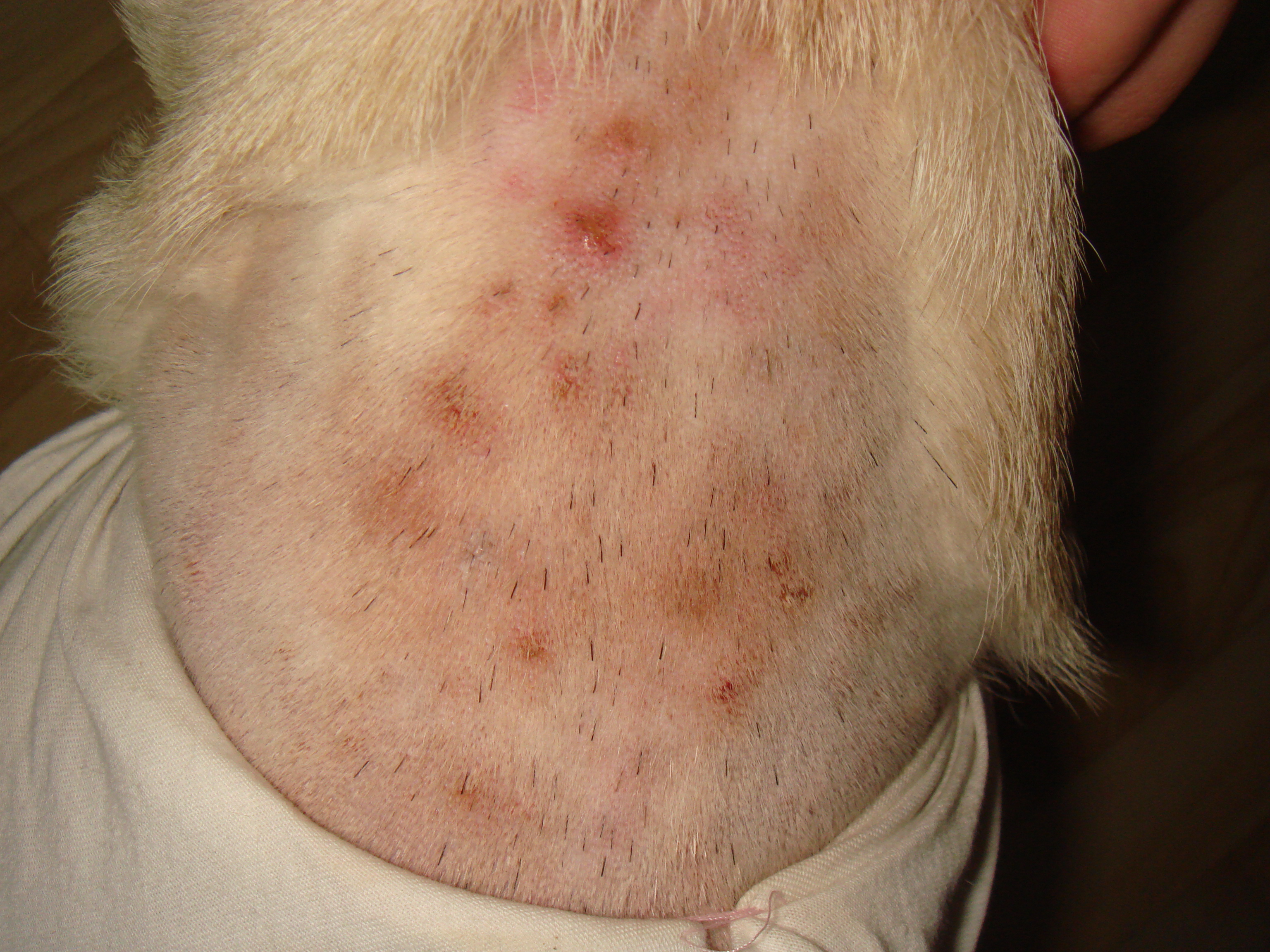 Добрый день! Меня зовут Ника и мы с Тошей здесь новички, но я надеюсь что пишу в правильную тему.. У нас сейчас чем-то похожая история. Нам 7 месяцев, и мы два дня назад первый раз купались на карьере (только вода там чистая). На следующий день с утра я ушла на работу, а когда пришла, шерсть стояла торчками (шампунем мы не мылись), и с одной стороны Тоша расчесал аж до крови. Было уже поздно идти к врачу.. (решили пойти с утра). Но на утра Тошка расчесал всю себе шею до крови. Место найти себе нигде не мог, забивался в углы.. Когда пришли к врачу, он сразу сказал, что надо брить, и то что это от купания (под шерстью там прело и вот теперь такие пятна). Два раза в день обрабатывать перекисью и мазать мазью (Virbac Cortizeme). Неделю сказал ходить колоть антибиотики. Сейчас я стараюсь Тошу не трогать, иначе он бегает по всей квартире и чешется.. Сделала я ему повязку, на то место, где выбрили, а то совсем весь в крови. Только я до конца не поняла от чего это.. Антошка кушает всё, очень любит овощи (огурцы, морковку, капусту и т.д.), фрукты (яблоки, груши и т.д.), до этого аллергии не на что не было, но в тот день когда мы купались, весь этот день мы были на даче.. Там много опавших зелёных яблок, он парочку съел, хоть я его и гоняла. Также там очень много комаров, которые его кусали.. И я теперь не понимаю от чего это может быть, если от воды.. То нам теперь вообще купаться нельзя? И правильно ли нам назначили лечение? А то мне самой очень больно, когда смотрю, как он мучается.. Я сфотографировала место, где ему выбрили (чтобы лучше было понятно о чём речь), может неудачный ракурс, но я не хочу беспокоить Тошку, он наконец-то заснул. И может вы знаете, как быстро отрастает шёрстка? Будем рады любому ответу. Заранее спасибо.