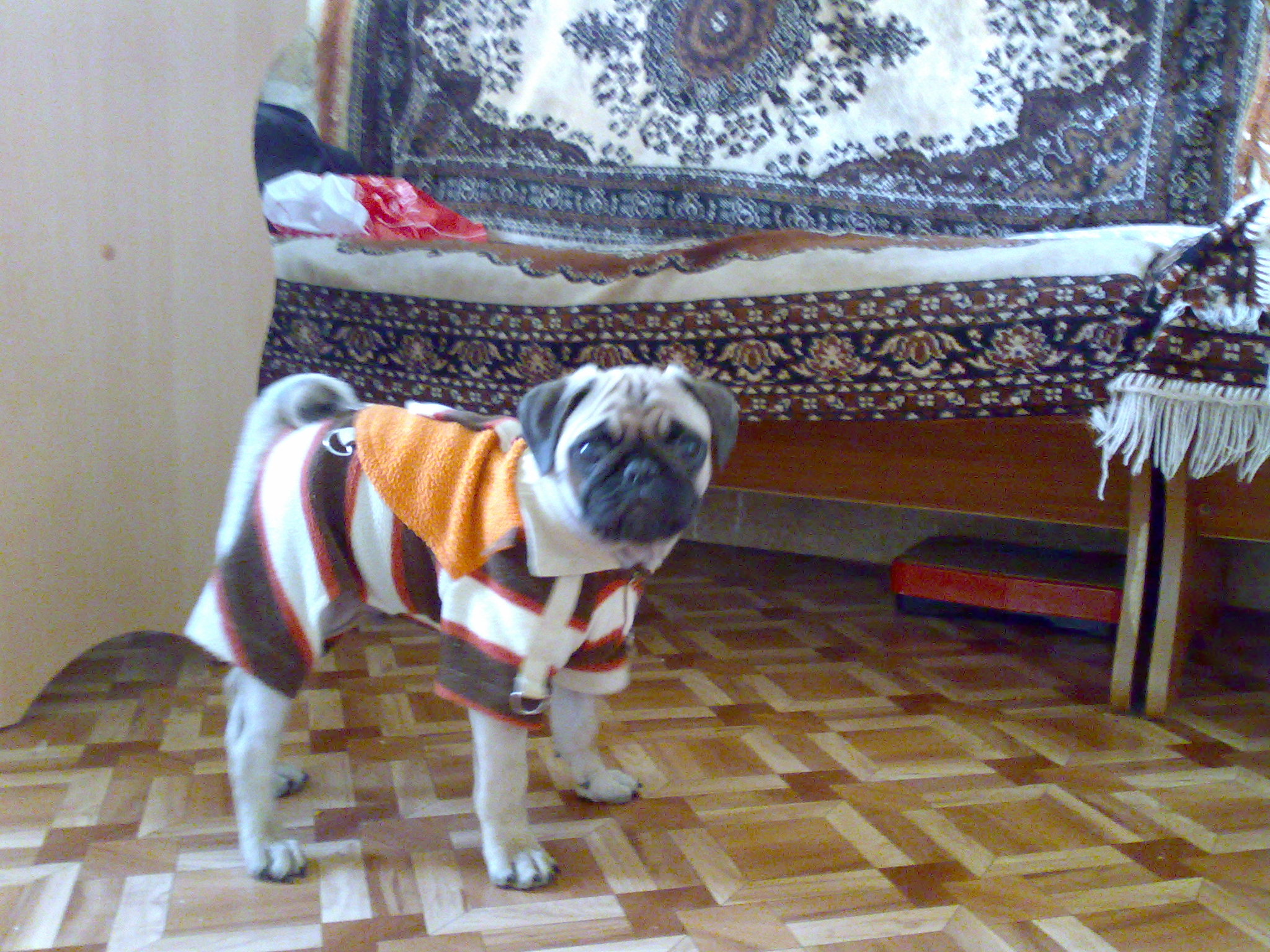 Еще раз спасибо всем за теплый прием! Сегодня мы впервые примерили рубашечку. Боня очень сопротивлялся. Но сдался.
