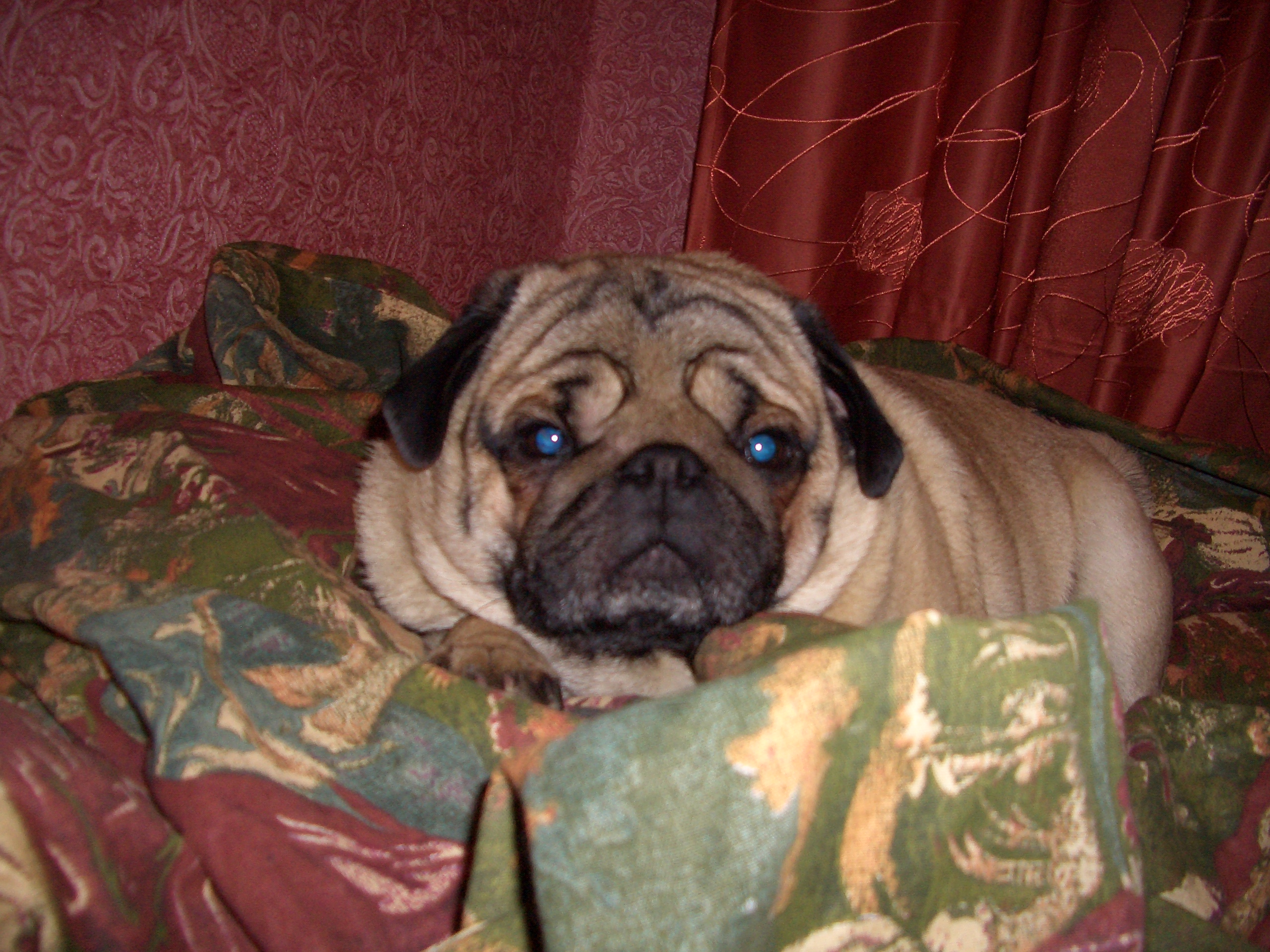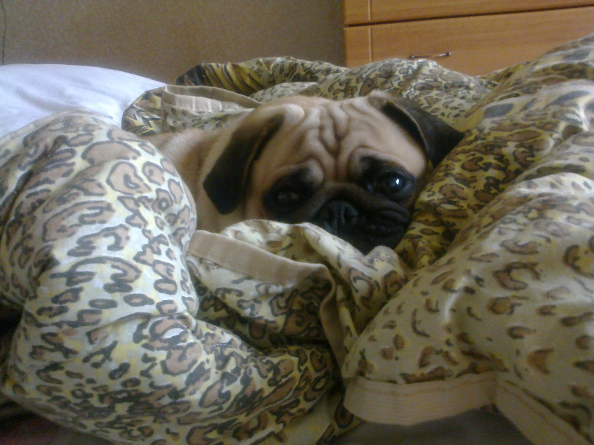 Чуть неправильная трактовка темы.Мопс спит не на кровати.Он спит рядом с хозяином.То есть если я лягу на коврике в коридоре то моя Буся будет рядом.В основном мопсы не зациклены на хозяйских кроватях.Они зациклены на хозяине(и если честно то и слово не правильное для для определения отношения мопса человеку).Тактильный контакт для мопса очень важен.