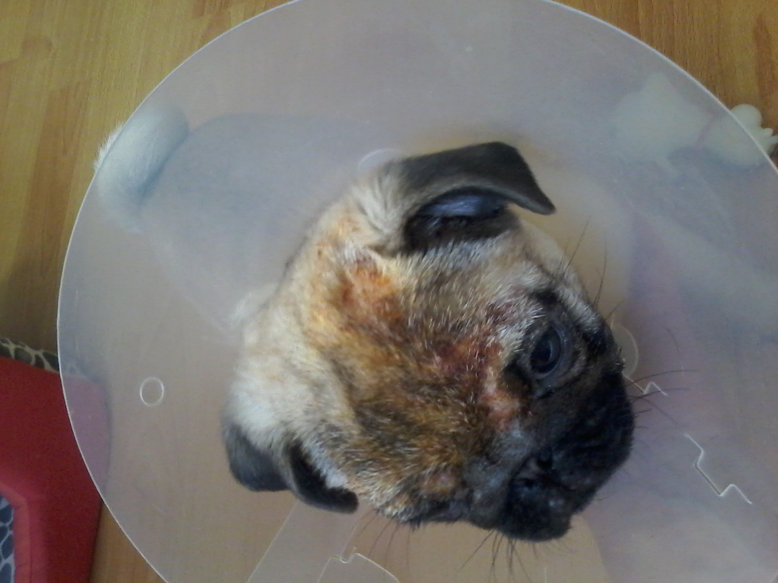 здравствуйте любители мопсов 2года мечтала о мопсе и тут мне муж подарил это чудо (IMG:style_emoticons/default/give_rose.gif) но моя радость длилась не долго ,моей девочке 3 месяца взяли мы ее в питомнике сразу встали на учет к ветеринару для прохождения плановых прививок проставили прививки от паразитов и как мне сказали для повышения имунитета перед плановыми прививками.за 4-5 дней до первой прививки у моей собаки появились покраснения и шелушения вокруг глаз и бровки и лобик врач сказал аллергия на корм надо менять,я кормила кормом бош паппи с курицей таким же как и в питомнике ,купила про план семга с рисом который посоветовала ветврач поставили первую прививку и дня через 2 началось ,она расчисала всю голову до кожи стал исходить неприятный запах извиняюсь но пахло как грязными мужскими носками это все попало на выходные ,в пон-к пошла в клинику и настояла чтобы взяли анализ на демодекоз вот жду и очень переживаю реветь уже не могу муж тоже оч,переживает выложу фото подскажите что это может быть ,врач временно одела воротник чтоб не чесала голову собака понимает что болеет настроение у нее не очень постоянно сидит в домике у себя у меня сердце разрывается,спросила врача какие методы лечения бывают она сказала только уколы и побочные эффекты могут быть осложнения на печень так как я живу в турции здесь еще не очень развито производство ветеринарных препаратов помогите плиз у меня сестра с мужем на этой неделе из россии поедут к нам в гости что надо привезут какие эффективные и безопасные лекарства есть в россии