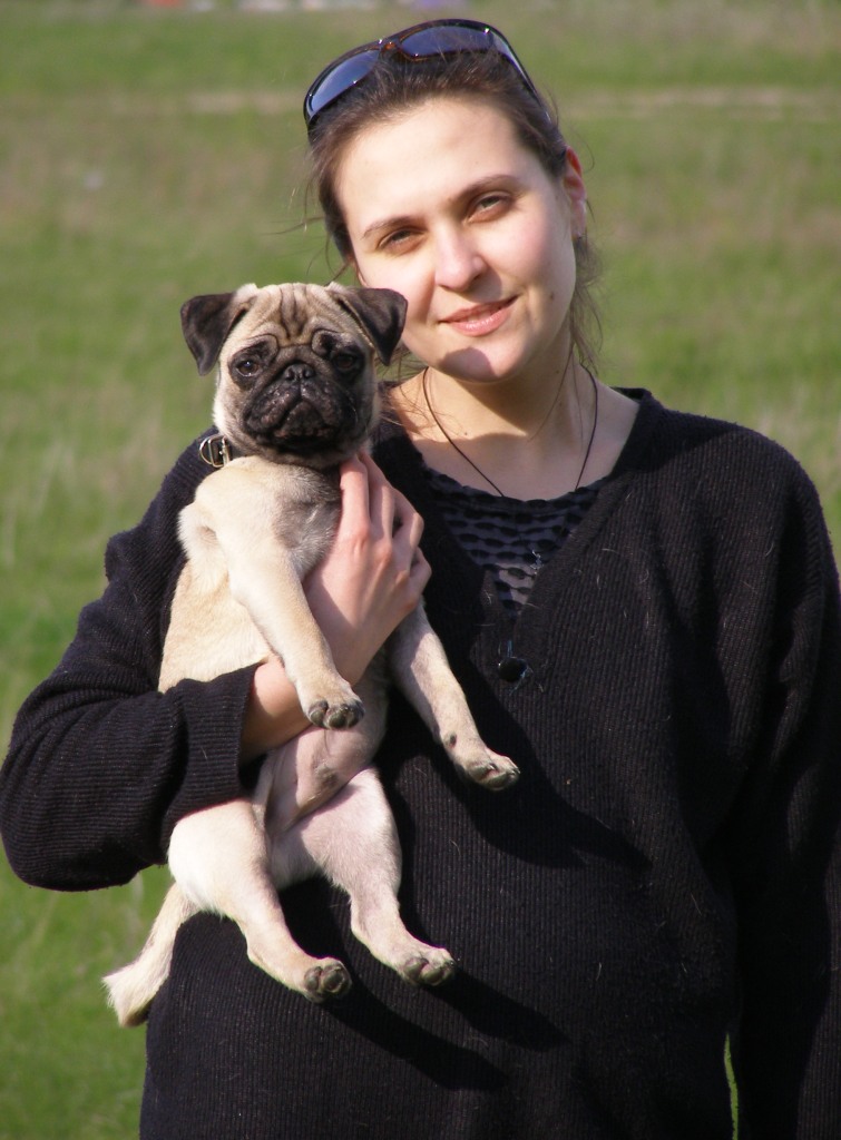 Всем здравствуйте! Мы новички на сайте. Вернее, я брожу по нему довольно давно, но участвовать в общении не решалась. Ну вот решилась! Меня зовут Елена, мою мопсодочу -- по-домашнему Луша. Собственно говоря, я раньше регистрировалась именно под ником "Луша", пока что-то не случилось, после чего меня перестали пускать на сайт, хотя и идентифицировали. Ну эту тему уже обсуждали, все в курсе. Слава Богу, всё наладилось. Живем мы в городе Пензе, работаю я в редакции газеты корректором. Кроме Луши, которой 1 год и 9 месяцев, у меня старенькая и больная американская кокер-спаниелька Элли, кошка дворянской породы Ксюша (сущая бандюганка!) и аквариум с двумя золотистыми телескопами-бабочками. Вот и всё моё "хозяйство". Не знаю, как кому, но мне досталось веретено кривое, а не мопся! По телеку рассказывали об этой породе и говорили, что мопсы не бегают, а степенно ходят. Ага! Только не моя Луша. У нее и моська-то лукавая.