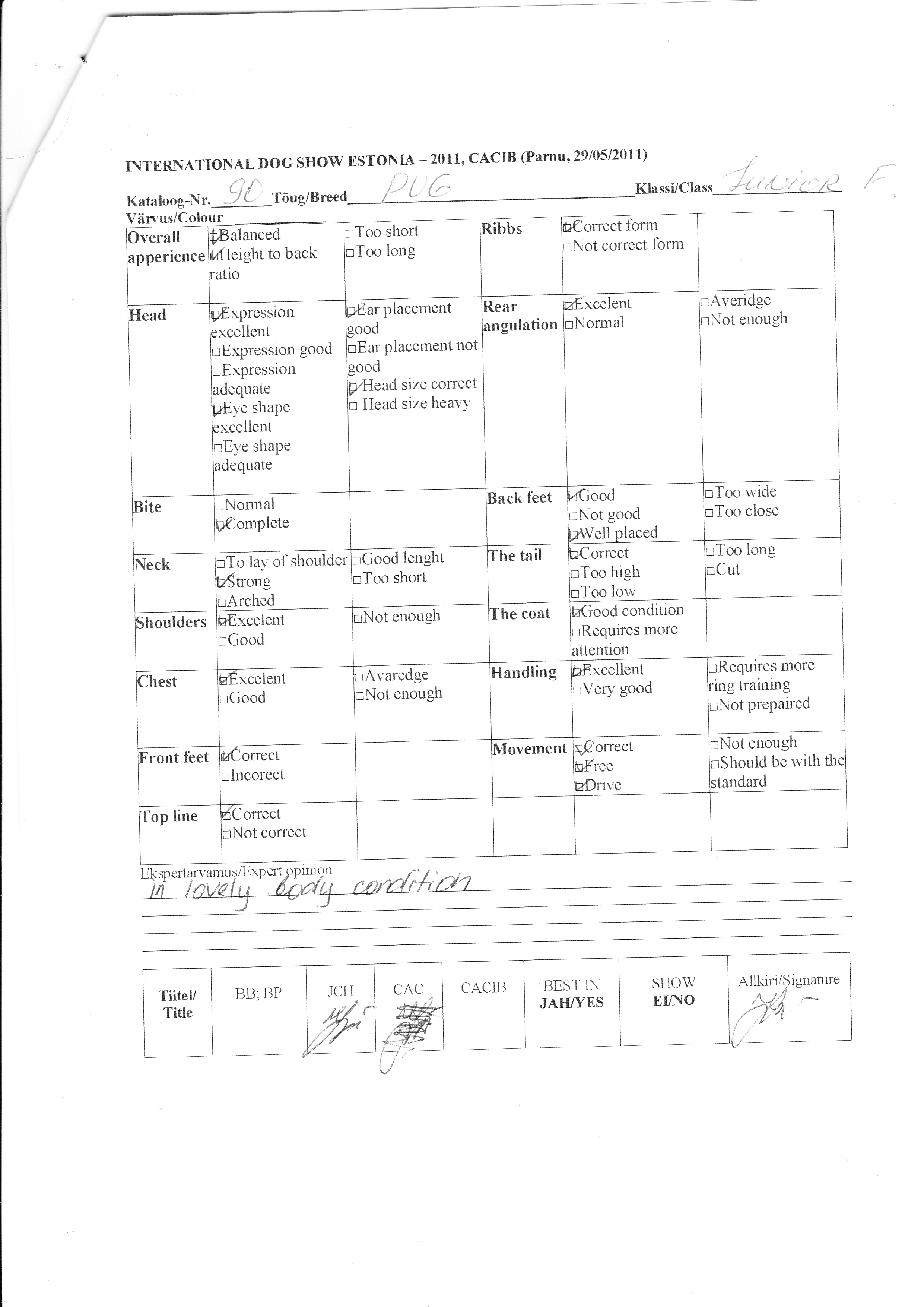Вера, как я поняла, Вам дали JCAC, это сертификат на звание Юного Чемпиона страны. Весь листок заполнен на английском и, как я поняла, все в порядке, все корректно, хорошо, свободно и т.д. и даже тело в отличной кондиции.