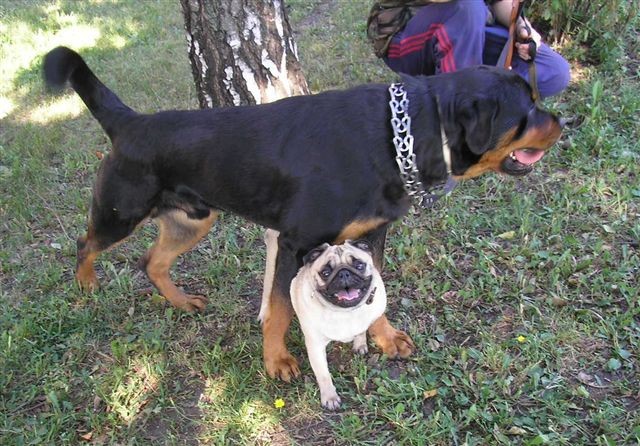 А у нас тоже подружка ротвейлер есть. Так Моня, когда с ней встречается, долго её облизывает, целует, и она его тоже.