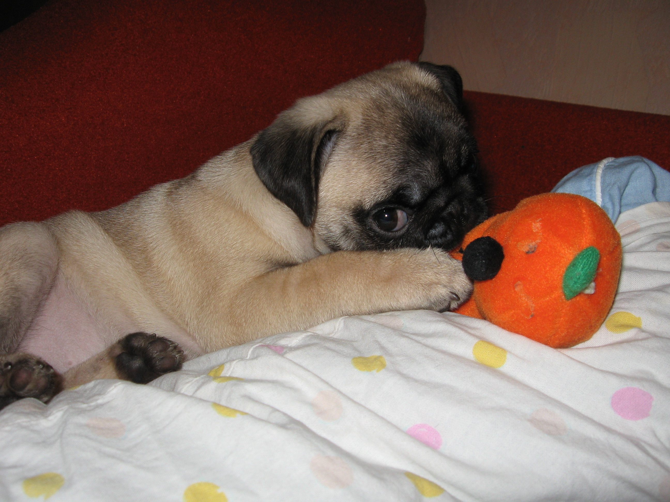 Здравствуйте, мы из Киева. На днях и у нас появился маленький мопсеныш! Взяли ее как Фиалку, зовем дома Фенечкой. Она одна из семерых щенков Фредерика из Клопсиков. Мама ее была приобретена в Толстеньком счастье(Эльза).Щены родились 21 декабря. Что-то не пойму ,загрузились ли фотки? Если нет--буду пробовать еще.
