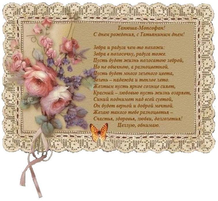 Танечка, с Днем Рождения ВАС! Желаем вам здоровья, бодрости, успеха, Больше радости и смеха, Счастья столько, сколько надо, Чтоб душа была бы рада, Чтобы сердце ваше пело, Чтобы радовало дело, Чтоб с годами не стареть, А цвести и молодеть! |