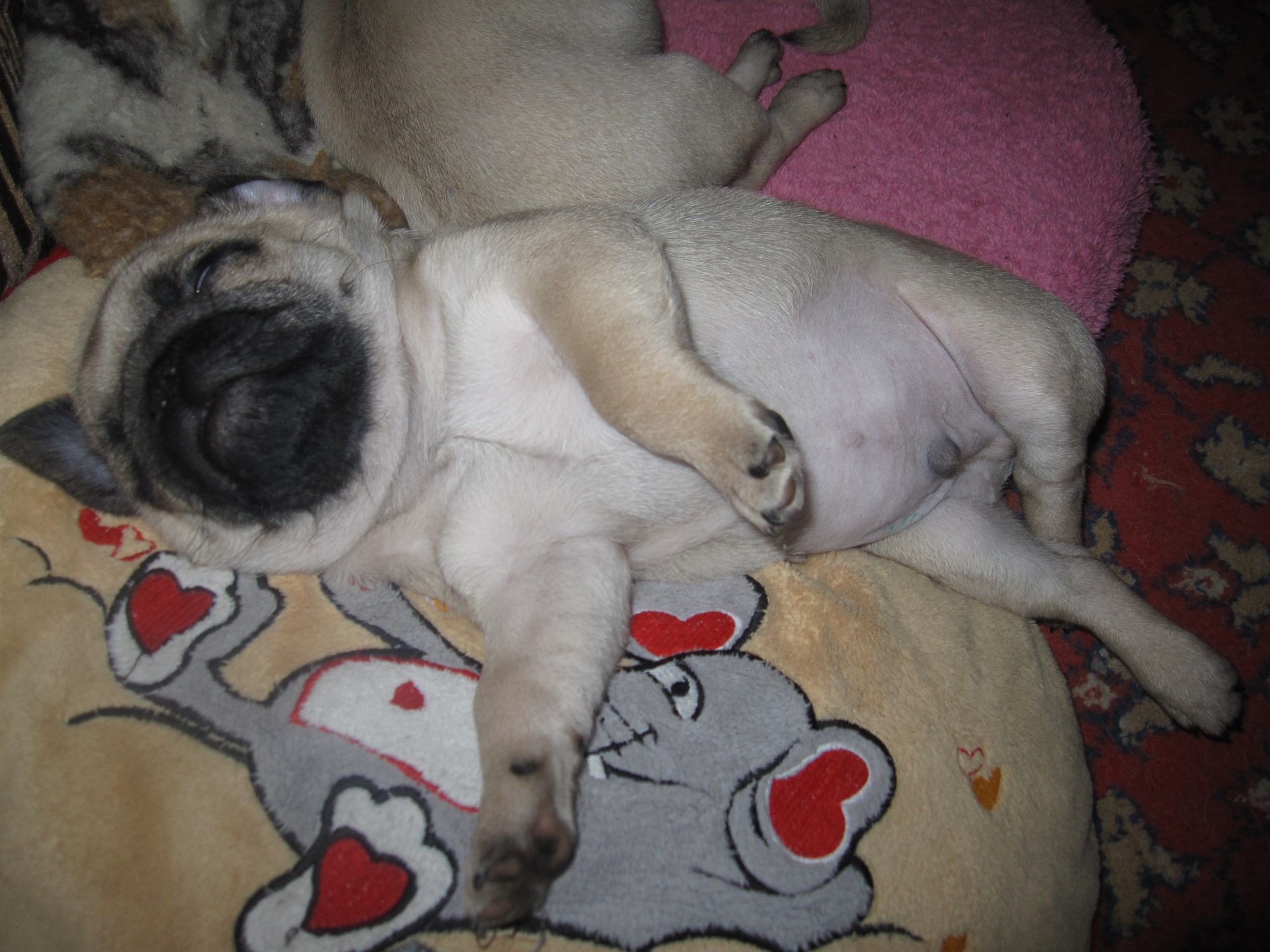 у моей коллеги есть мопс. Когда мопсюшка была маленькая с ней приключилась такая история - хозяйка все переживала, что щенок голодный и кормила, кормила, кормила. В один из дней хозяйка пришла домой, а собака лежит на полу, скулит и встать не может. Щенка сразу же отвезли в клинику. Сделали клизму, промыли желудок, у щенка было ожирение такой формы, что он не мог подняться на лапы. Месяц жил на кефире. Отходили и все закончилось хорошо. Вот я и переживаю, что что-то подобное может быть если СЕмёна много кормить. Ему сколько не дай он все равно всю миску вылижет. Врачи тогда хозяйке сказали, что если бы она сразу не привезла щенка, через пару часов она просто умерла бы((((((