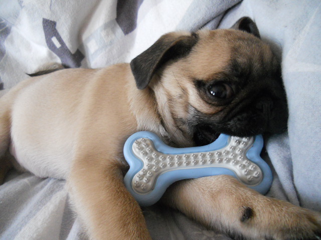 У мопсят маленькие грыжи не редкость, уж больно они вертлявые. Ничего клеить не надо. Просто проходите мимо, надавите на грыжу, смотрите телевиор, возьмите малышку, надавите на грыжку и держите. Каждый раз, когда Вы будете это делать, пупочное кольцо будет сужаться на какие-то доли микронов. Ребенок растет, мышцы укрепляются, колечко постепенно закроется и грыжа пропадет. Не волнуйтесь! Спасибо! Просто хочется ребенку обеспечить надлежащий уход, вот отсюда и гипер забота (IMG:style_emoticons/default/crazy.gif) Уж точно, мопсята очень вертлявые. Вчера бегала с костью от голени индейки, пыталась спрятать. Снять ее за этим делом не смогли, так как смеялись, согнувшись от боли в животе (IMG:style_emoticons/default/yahoo.gif) Наша малышка с этакой костью динозавра. Затем показала папе все, что умеет, такие сальто вытворяла, прыгая по кровати, он даже усомнился, что Люсси собачка, а не лягушонок и крольчонок в одном лице. Утром сегодня отказалась от творога с ряженкой, оказывается у нее была заначка под подушкой ее кроватки в виде кусочка телятины (и когда успевает прятать?) Покормили с утра говядиной с хрящиками. Но и хрящик она закопала под подушечкой, лежащей для нее на полу. Запасливая наша Люсси, домовитая. |