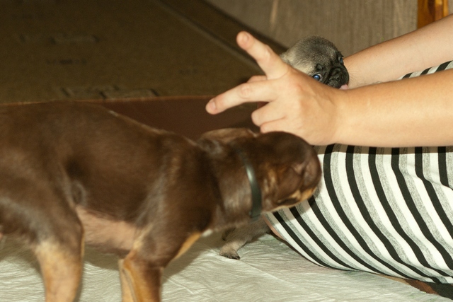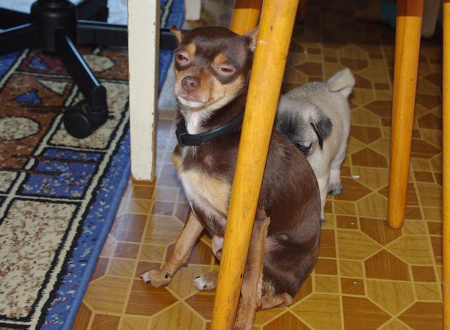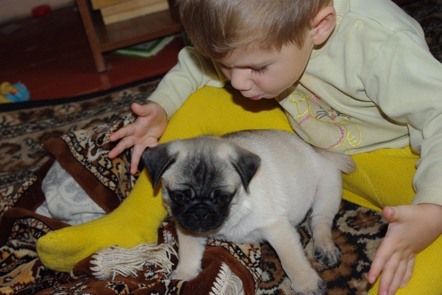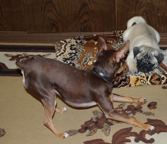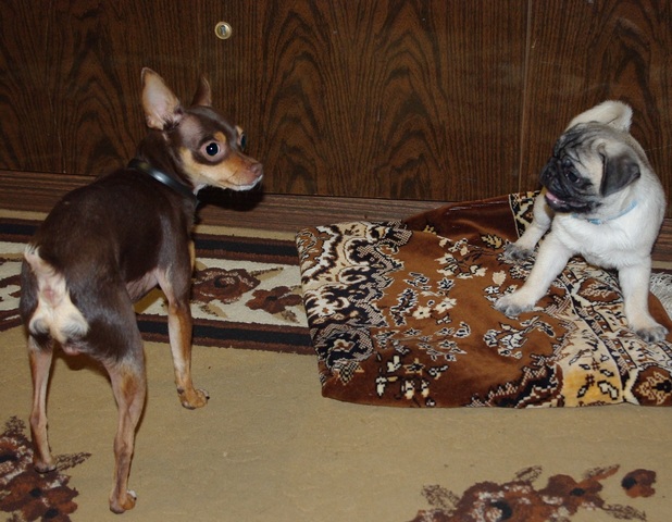 Привет! Наше плюшевое чудо живет у нас уже третью неделю!Зовут его Веня,Венюшка,Веник. Меня зовут Екатерина,влюбилась в мопсов совсем не давно(у соседей по подъезду живет замечательная мопсодевочка и я имела не осторожность ее погладить и все...пропала я)....влюбилась насмерть..... (IMG:style_emoticons/default/wub.gif) Начала перелопачивать об этой породе инет,а также объявления о покупке/продаже щенков...с несчастным видом....А почему с несчастным,да просто в доме уже живет нервный той,две морских свинки и еще трое детей...ну,думаю муж ни за что не захочет покупать щенка...а он взял да и подарил...я была в шоке....(радостном шоке)Про нашего тоя Лакки это целая история,одна знакомая(к счастью очень далеко знакомая,а теперь и вовсе стала почти не знакомой)девушка завела себе "сумочку",и вдруг выясняется, что с этой "сумочкой" надо заниматься,гулять и пр и пр. решила его усыпить (IMG:style_emoticons/default/cray.gif) хорошо ее сердобольная мама вмешалась...и так это несчастное создание оказалось у нас.у него были атрофированы лапы(потому что не ходил почти,а все время носили под мышкой,"сумочка" ведь,а днем в квартире привязывали...)когда его к нам привезли и я стала его осматривать,нащупала отечную спину,на вопрос ЧТО это?был ответ команду "ремень" знает оч хорошо!Больше я ничего не спрашивала,быстро их выпроводила и сказала,что если надумают его забрать,то только через мой труп!!!!!Ребенку на тот момент было 11мес.Жалко его до жути, и даже до сих пор,зашуганое существо....он у нас уже 1,5 года и только с пол года как перестал писаться когда его зовешь....потому что (как я поняла) звали его только для того что бы отлупить... вообщем такая история, всего и не напишешь...переживала как будет мой истеричка воспринимать нового жильца,а он очень даже хорошо его воспринял,правда первую неделю старался передвигать по верхам,но сей час уже гоняют в догонялки по всему дому...стая увеличилась и радость тоже!!!!!