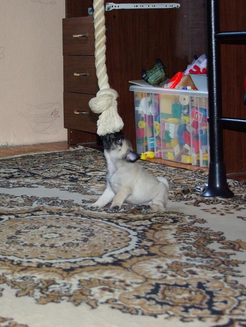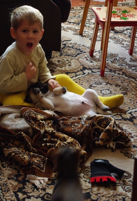 Да вот такой наш Венюха!Гимнастом он был первую неделю пребывания дома,а теперь он борец(наскакивает на всех обитателей и толкает)))а еще бегун-слонопотам(это после тощего тоя такая радость, есть где потискать эту плюшку любимую)Но сыновья Лакки(тоя) очень любят и уговаривают(особенно средний ему 6,5 лет)"Ну ты же теперь старший брат!!!!Должен маленькому уступать!!!" ну цирк просто!!!!