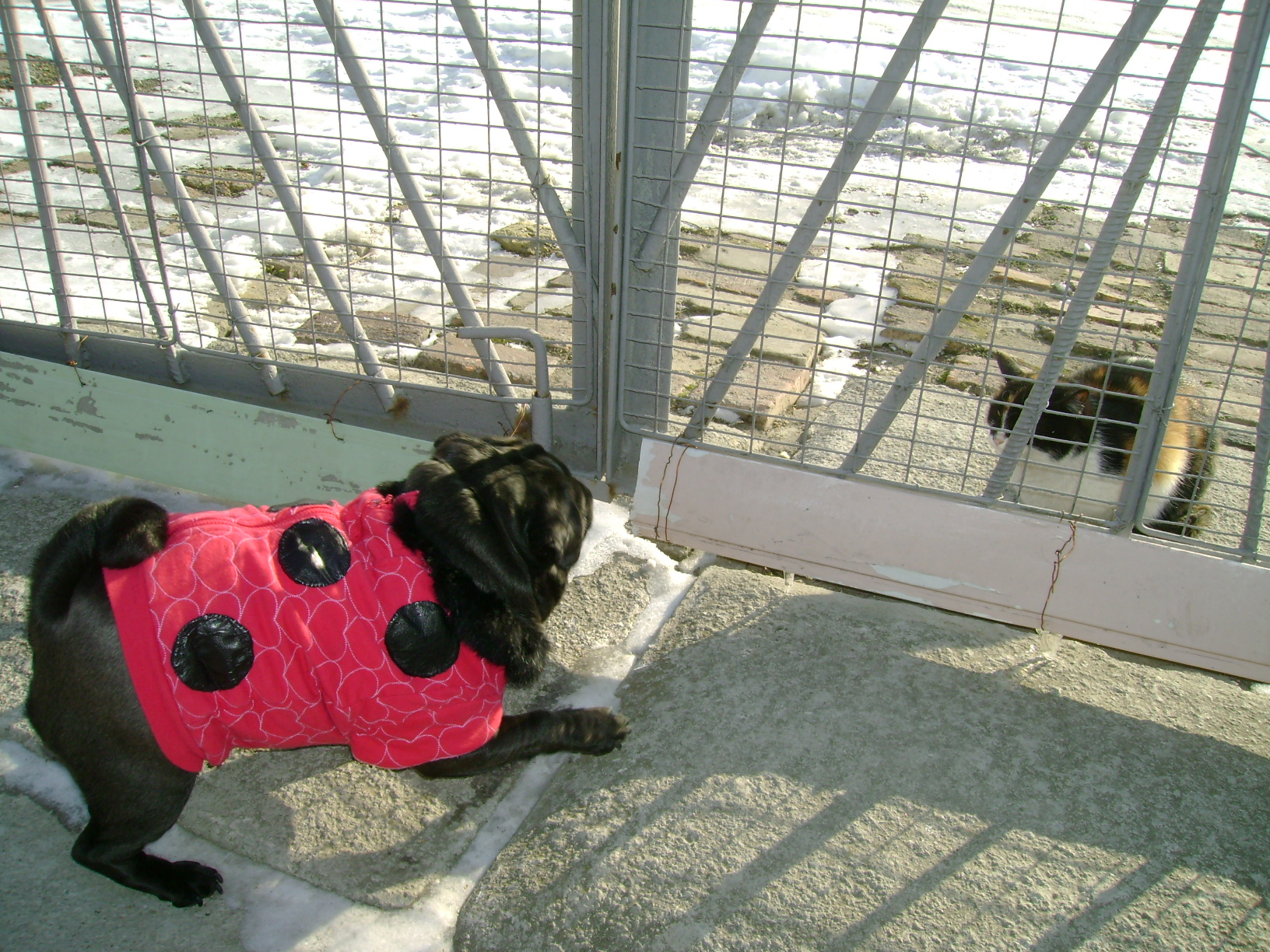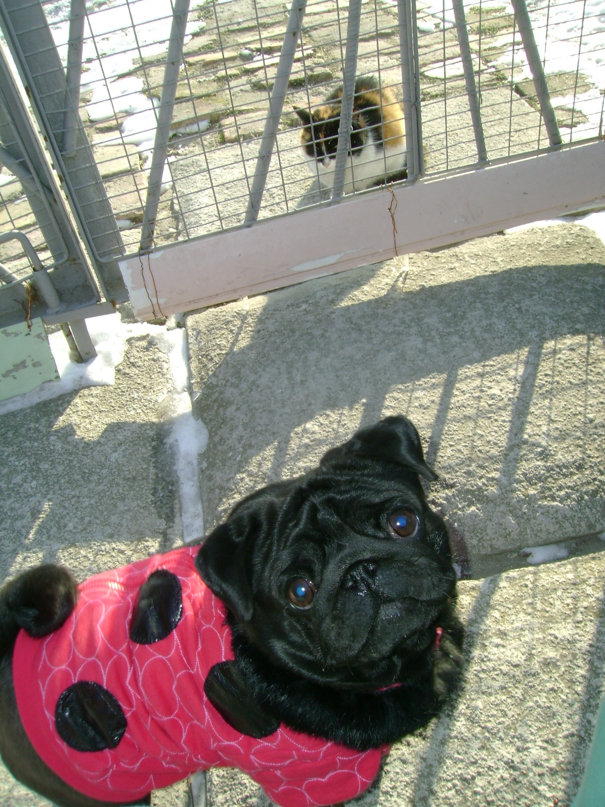 А может котик пришёлнавеки здесь поселиться?))))Видит,собачка бегает упитанная,в костюмчике шикарном.Значит любят в этом доме животных,берегут и заботятся .Может и котику местечко найдётся?Подумал котик и решил от ворот никуда не уходить.))))