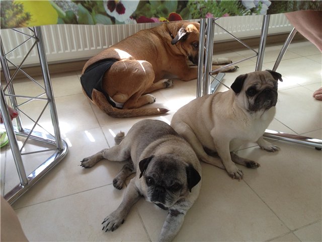 А где сейчас Леся и как у нее дела? Летиция сейчас на передержке у Ирины (у девушки, которая приютила у себя уже одну мопсишку-найденыша, если кто помнит про историю с камнем, который вытащили у нее при операции). Вот новые фоточки 2-х девиц: |