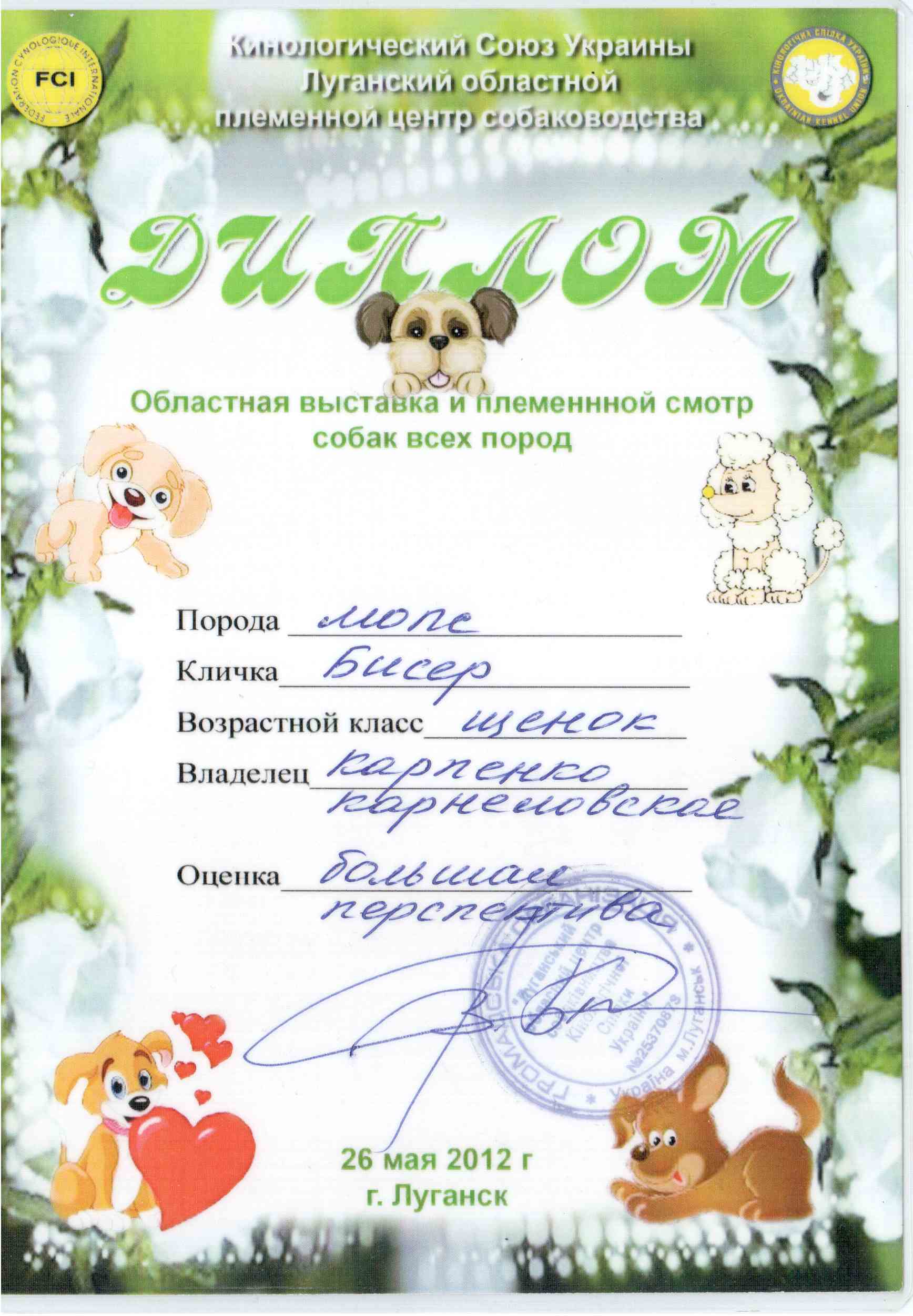 Бисер стоял как Апполон(кстати, так зовут Бисера папу)- ну просто красавец.. а вот пройтись никак ровно не смог - отвлекали его "гав" со стороны.. Судье очень Бисер понравился.. сказал что настоящий кабель!! Но как мне показалось -самому Бисеру не очень-то понравилось.. то стоять, то зубы, попу смотрят.. скоро поедем скорей всего в Донецк - мы уже будем юниоры) |