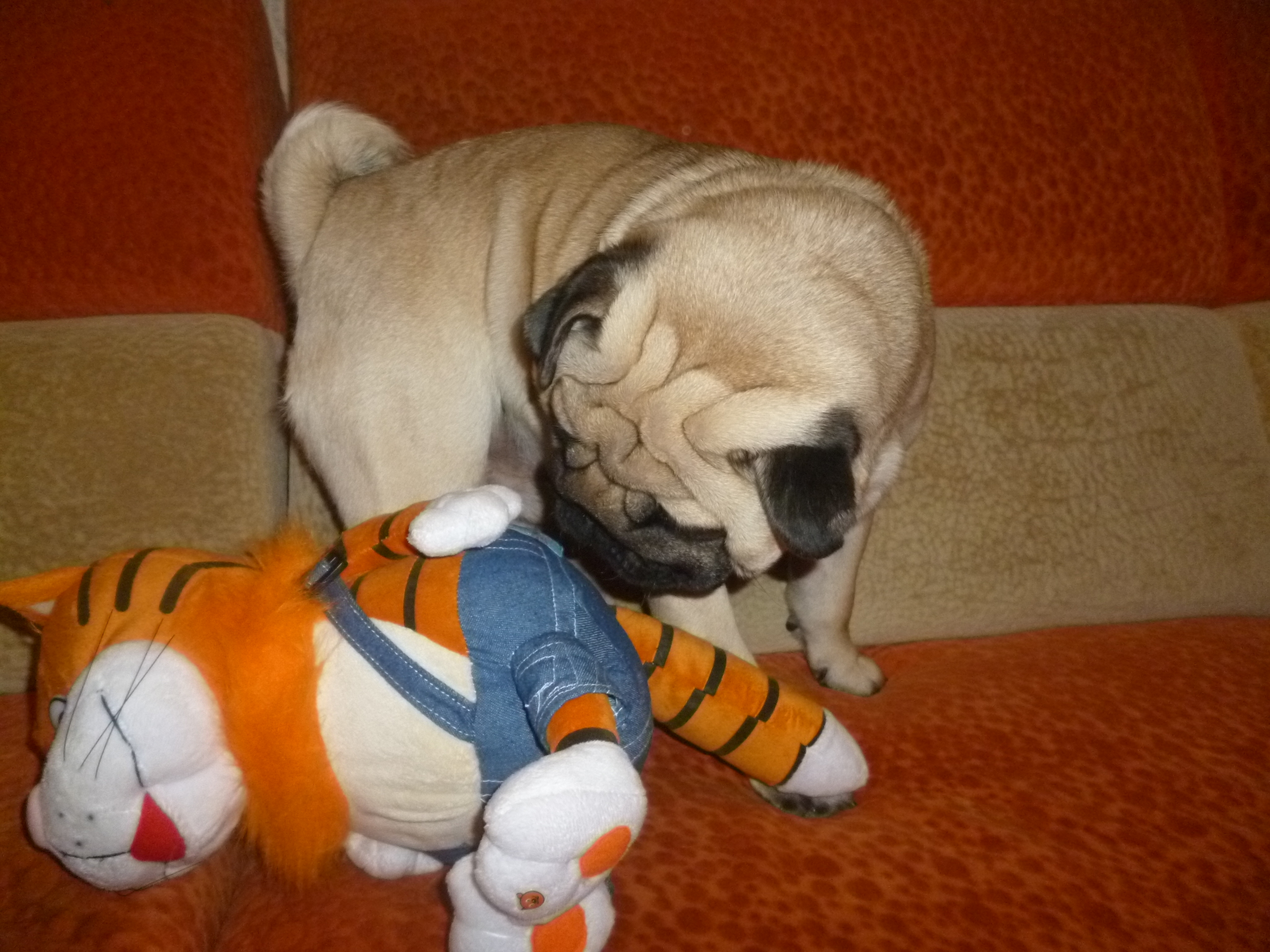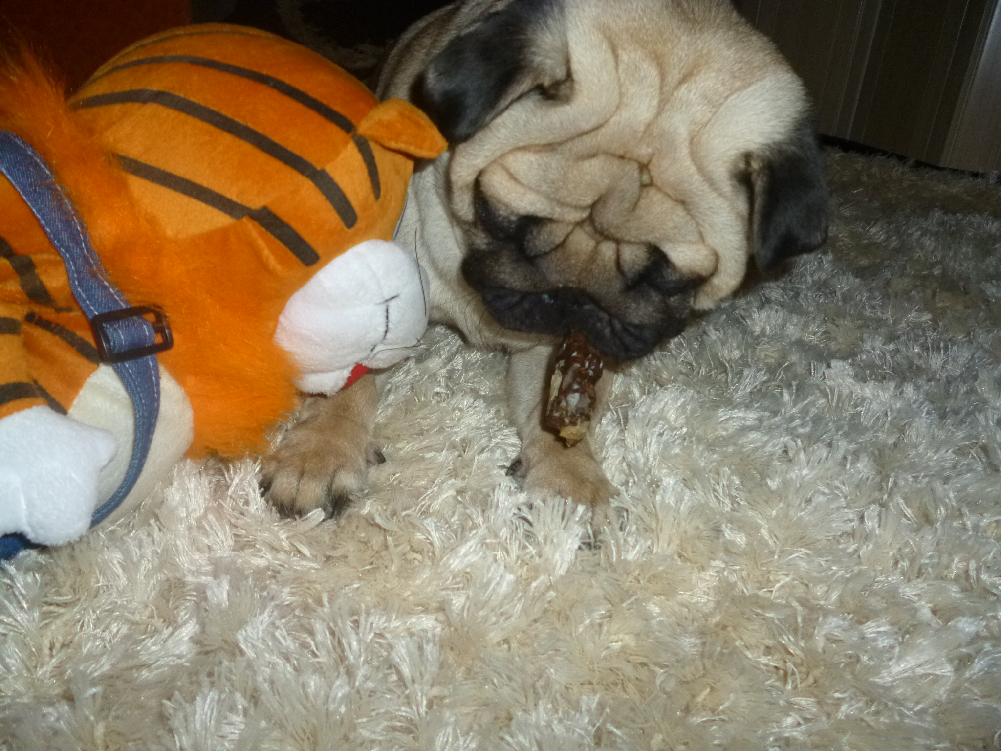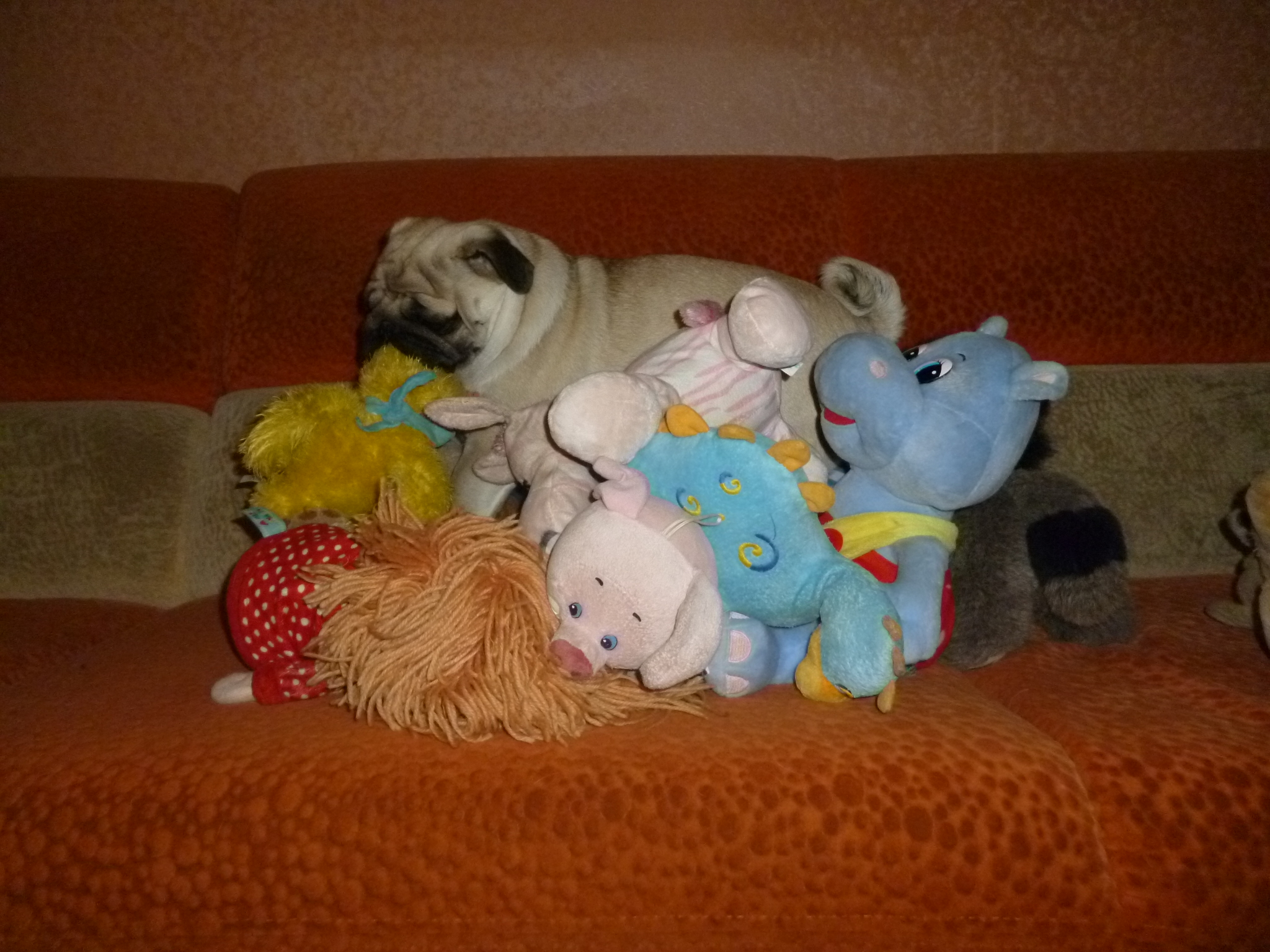 Ого! Сколько игрушек! Просто мопсиное богатство! У меня Зюма тоже больше уважает мягкие игрушки, но такого количества у нее пока нет. Завидуем1 Наверное все мопсятки, любят мягкие игрушки. К пищащим он...ну может поиграть и чуть погрызть, не более...А вот к мягким...тяга. Раз в неделю точно ему покупаю, а к каким он стал равнодушен, раздаю. Он знает кого и как зовут. Выкладываю несколько, ухожу от него...Мои моська всегда рядом, хвост ))) Говорю ему принеси маме Ромку..он несёт именно его, если мишку то мишку и прёт...Сначала меня это удивляло...а сейчас уже все привыкли. Девочки я искала в темах и не нашла...У меня парень стал метить...КАРАУЛ!!! Гуляет часто, не болеет...Понимает, что нельзя...но всё равно.. Когда застукала его, у него глаза с полтинник, взгляд....Мол маман понимаю, но ничего не могу поделать. Купила в вет.аптеке спрей...бесполезно. |