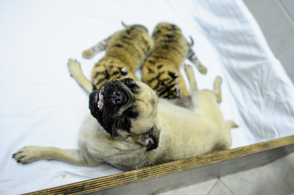 В зоопарке сочинского санатория "Октябрьский" четырех новорожденных тигрят "усыновили" два мопса. Их привезли из специального питомника в Ейске после того, как тигрица отказалась кормить свое потомство.