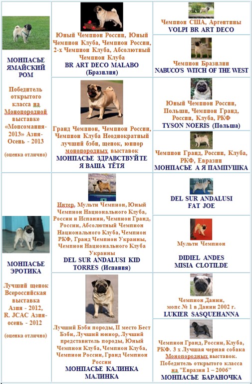 Возможна рассрочка до 2 лет. В родословной этой мопси находятся такие звёзды, как: DEL SUR ANDALUSI KID TORRES - Мультичемпион, Чемпион Испании, Гранд Чемпион России, Абсолютный Чемпион национального Клуба, Гранд Чемпион Беларуси, Гранд Чемпион Украины. CORAL BAYS PINK CONFETTI - Интерчемпион, Чемпион Америки, Мексики, Испании. BR ART DEKO MALABO (МАГНАТ) - Чемпион Гранд, России, 3х Национального Клуба,2х РКФ Абсолютный Чемпион Национального клуба породы. Импорт Бразилия. VOLPI BR ART DEKO - Чемпион США, Аргентины. NABUCOS WITCH OF THE WEST - Чемпион Бразилии. BENITO ASTARTE BAST (Польша) - Интерчемпион, Чемпион Европы, Польши, России, Белоруссии. LUKIER SASQUEHANNA - Чемпион Дании. SHEFFIELDS SHENANDOAN - Интерчемпион, Чемпион США, Польши, Финляндии, Швеции, Англии, Чемпион Европы. МОНПАСЬЕ ЗДРАВСТВУЙТЕ Я ВАША ТЁТЯ - Гранд Чемпион, Чемпион России, 4х Клуба. МОНПАСЬЕ КАЛИНКА МАЛИНКА - Гранд Чемпион, Чемпион России, Чемпион клуба. И другие известные чемпионы. Фотографии щенков на сайте http://zolotoypion.jimdo.com Сообщение отредактировал Виталий_70 - 2.2.2014, 12:04 |