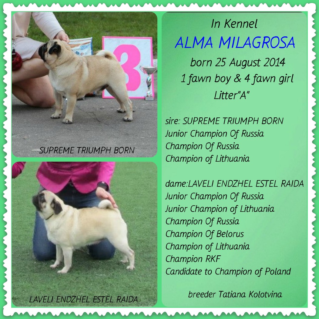В помёте 4 девицы (одна девочка зарезервирована) и 1 парень . Папа малышей - привозной, интересные крови , юный чемпион России, чемпион России, Литвы ,кандидат в чемпионы НКП .