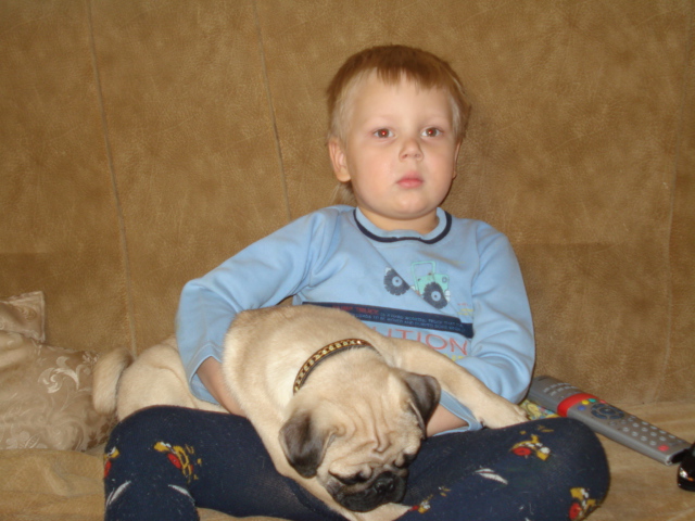 Нет у меня до него год назат была, первая мопсюля(Булл Стронг Красотка) дома Мотя. Но ее в прошлом году у меня в ногах ( тяжело вспоминать) загрызла соседская собака, сорвалась с цепи, подлезла под забором и все...