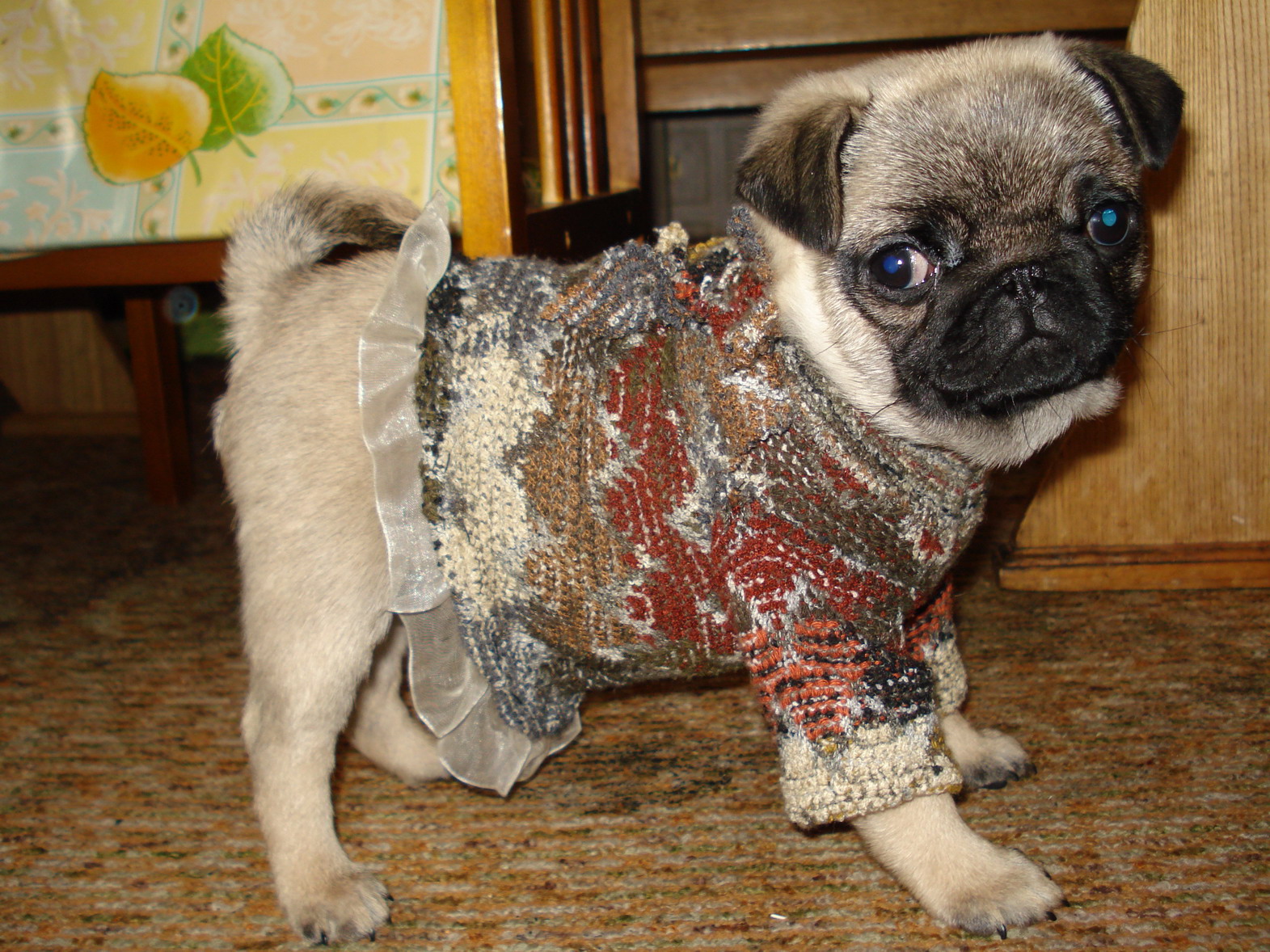 Боня рада, что понравились наши фотки. Старший (мой сын) не то,что не в обиде он был в диком восторге, потом скормил весь пирожок Борошке.Он его так любит готов ему все самое лучшее отдать. А свитерок в полоску я купила, давно в инете заприметила, еще когда первая мопся была а потом случайно наткнулась в зоомагазине. Вязать не умею, правда посещала курсы по вязанию в школе но это было так давно единственное, что могу связать это шарф и то времени займет неделю. В тапках мы ходить пока не очень научились но одевать очень любим.