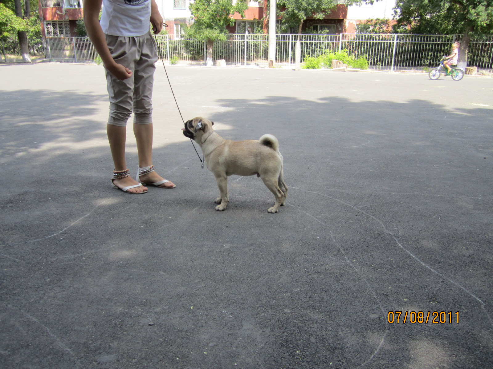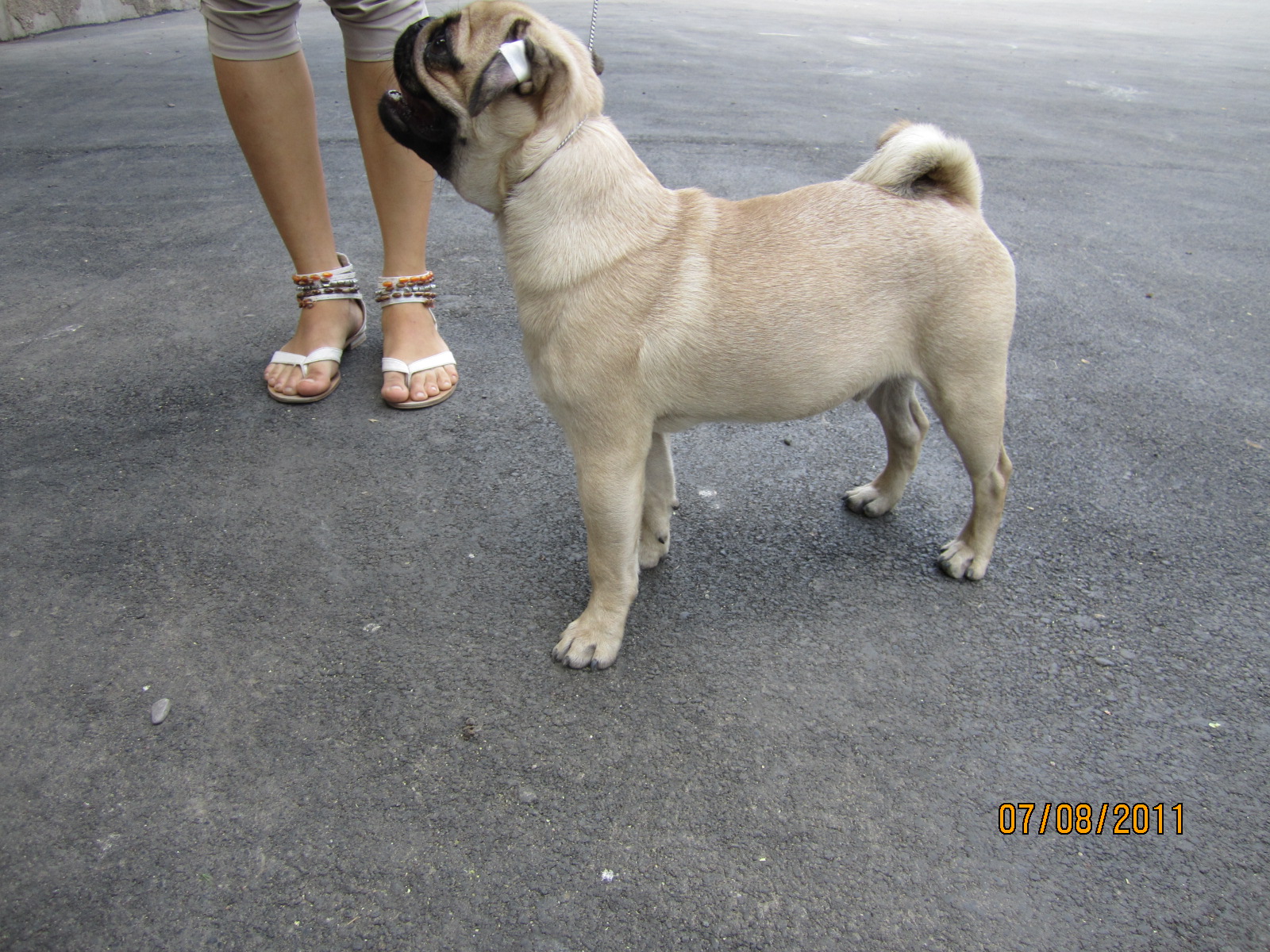 Угол задних лап у мопса должен быть не таким, как у других пород в стойке. Мопсам лапки не оттягивают.