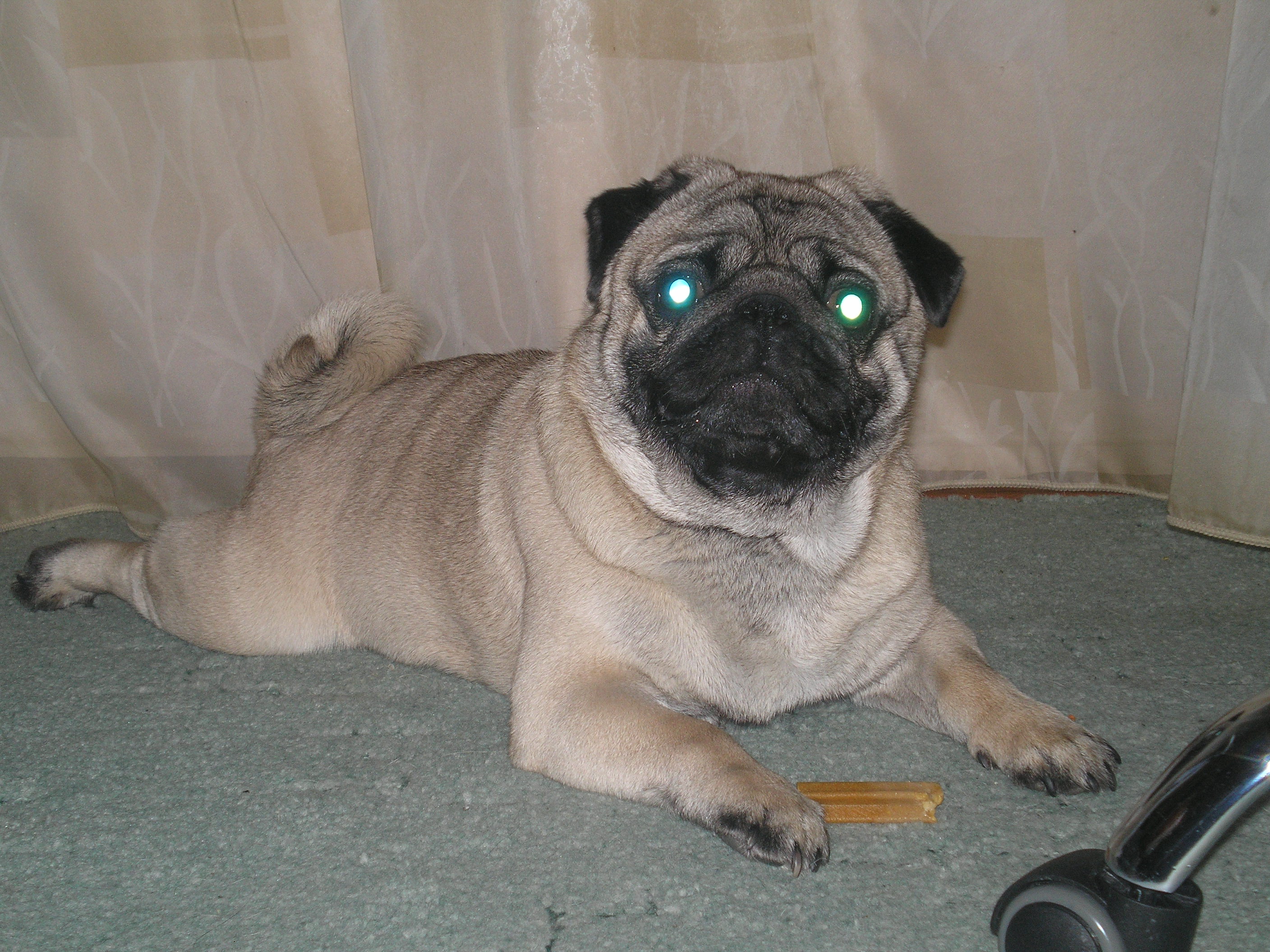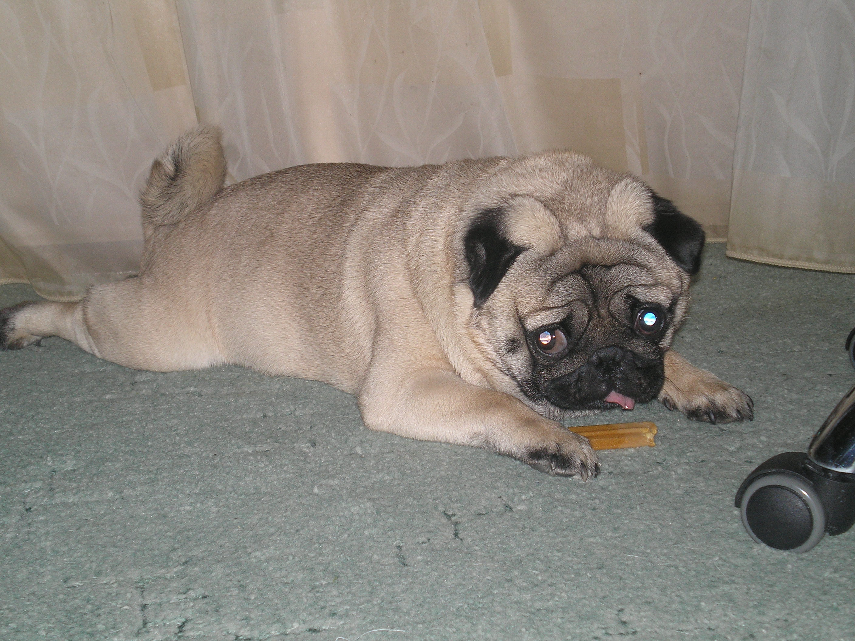 Считалочка про мопса: Раз, два, три , четыре , пять вышел мопся погулять! Побежал туда-сюда, прыгает как егоза, разорвал он все газеты, выпросил аж три котлеты и улегся на кровать до обеда досыпать! На бочок перевернулся, на подушке растянулся, лапками подрыгал и опять попрыгал! Вот отнял у сына мишку, утащил куда-то книжку и улегся он опять поваляться, подремать. Папа тут пришел с работы-мопсе новые заботы, нужно тапочки нести, улыбаясь от дущи. Вот пора ложиться спать на хозяйскую кровать, день прошел в трудах, заботах, ночью мопсу спать охота!
