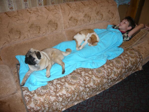 У нас сильно заболел ребенок. Поймал вирусную инфекцию и температура выше 39 держится 3-й день. Посмотрите, как звери поддерживают его. И скорее всего лечат, т.к. эффект от кошко- и собакотерапии доказан.