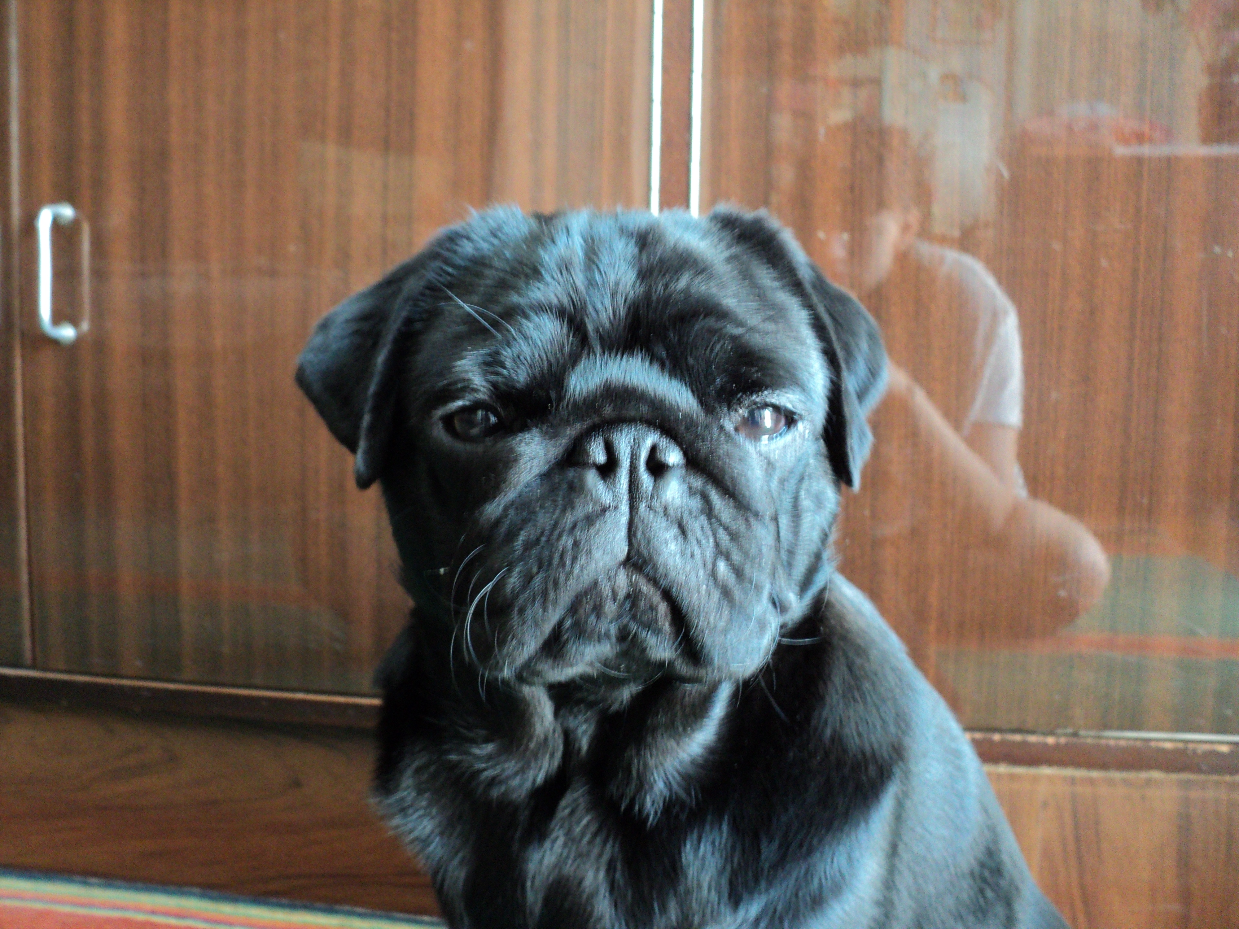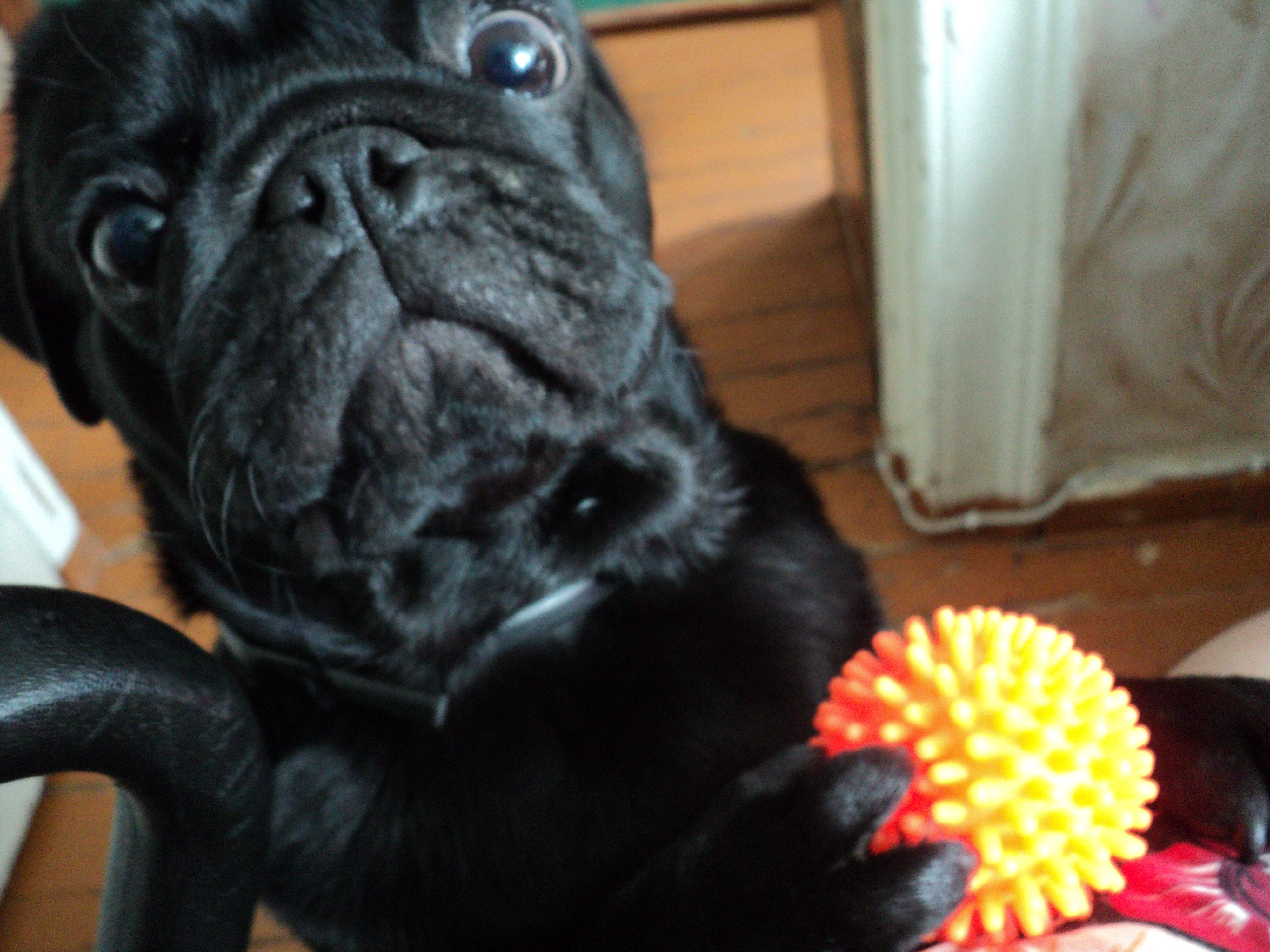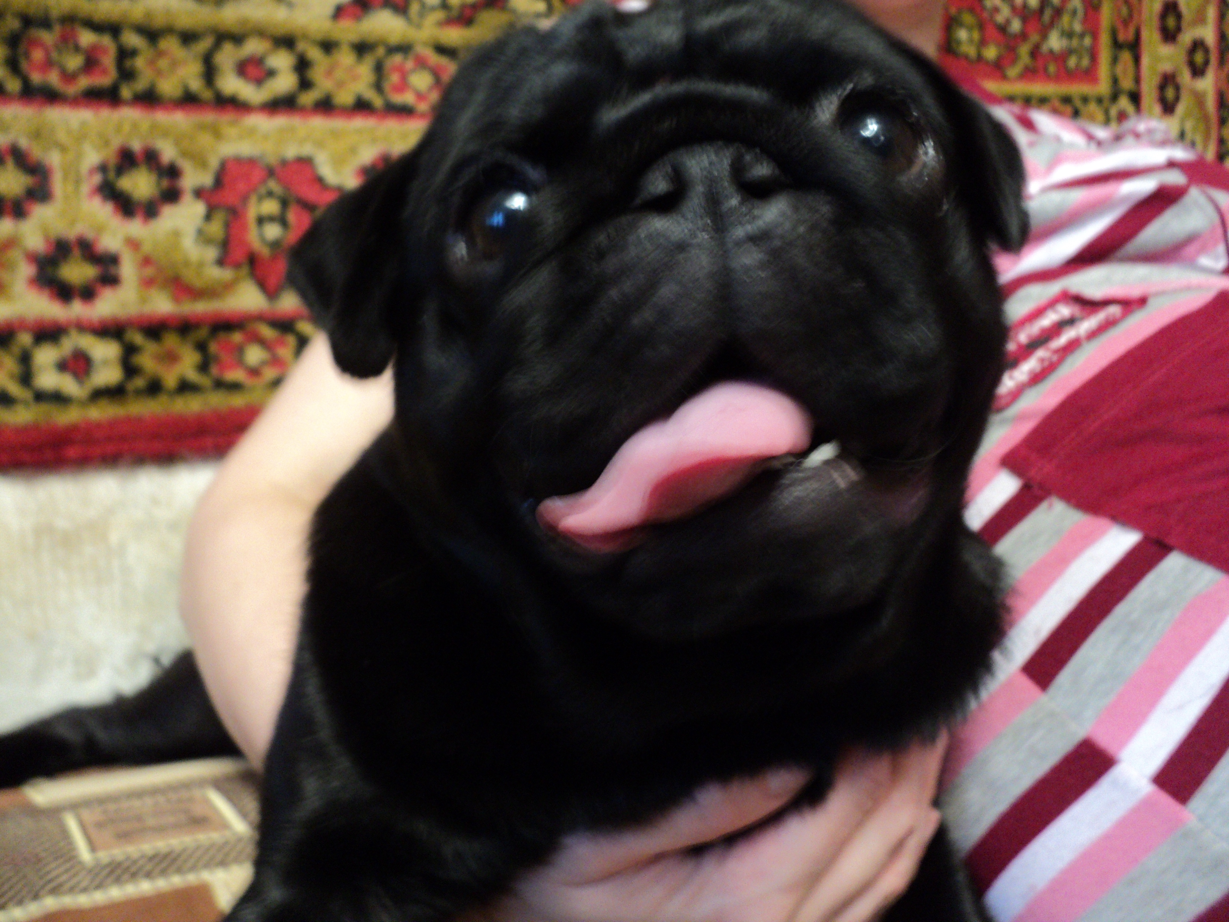 Вот уже как пятый месяц живет с нами замечательный мопся)Зовут его Ельзар Чаки,но его домашняя кличка Гоша.Ему третьего числа исполнился годик,он очень игривый , озорной и самостоятельный мальчик,постепенно приучаем его к командам и знаем уже такие ,как : сидеть,кушать,нельзя,иди попу надеру,птички и команду барьер)У него отменный аппетит,с тарелки мы сметаем все,еще нужно обязательно посмотреть все ли он съел,иначе БЕРЕГИСЬ,миска будет в зале